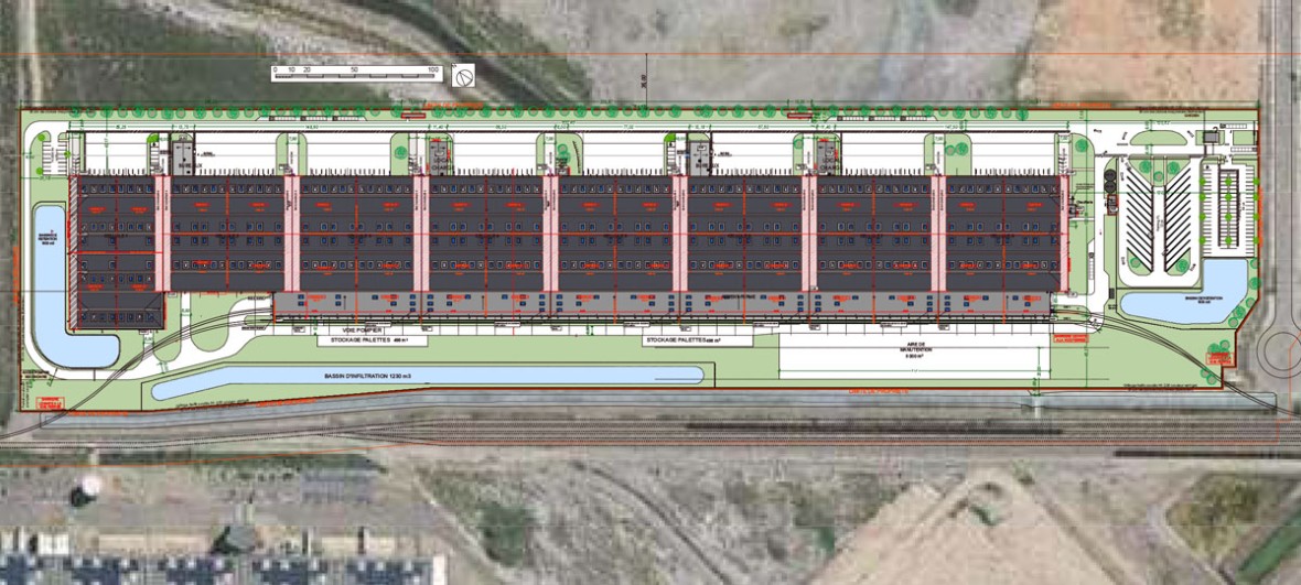 - Adossé au bâtiment principal, un auvent fermé sera aménagé pour l’accès ferré. Il abritera 1 voie ferrée et leur zone de déchargement de part et d’autre), une voie de manœuvre locomotive sera aménagée le long de sa façade Sud-Ouest.